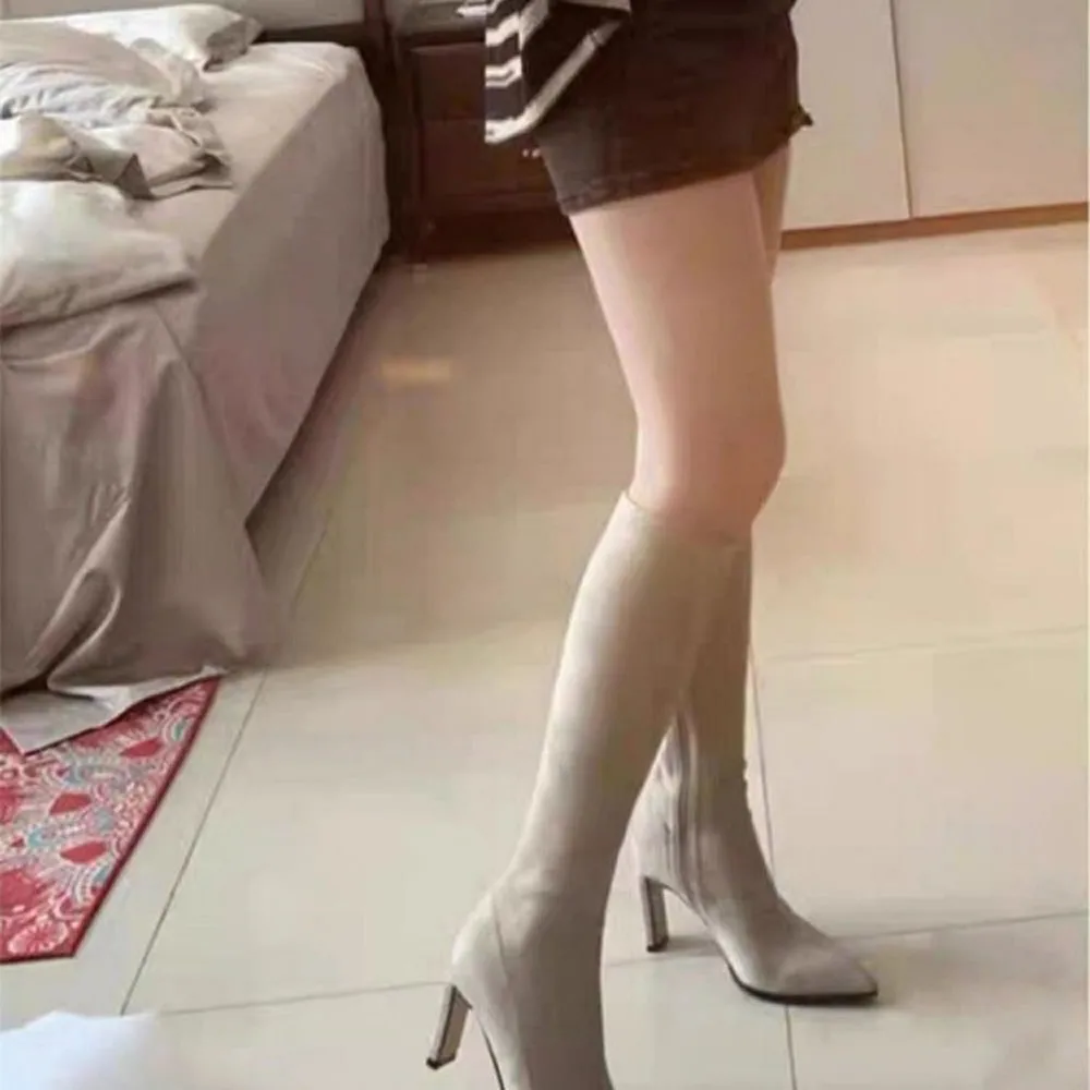 Botas altas con tacón de aguja de gamuza y punta puntiaguda, tacones altos antideslizantes y resistentes al desgaste con cremallera lateral, otoño