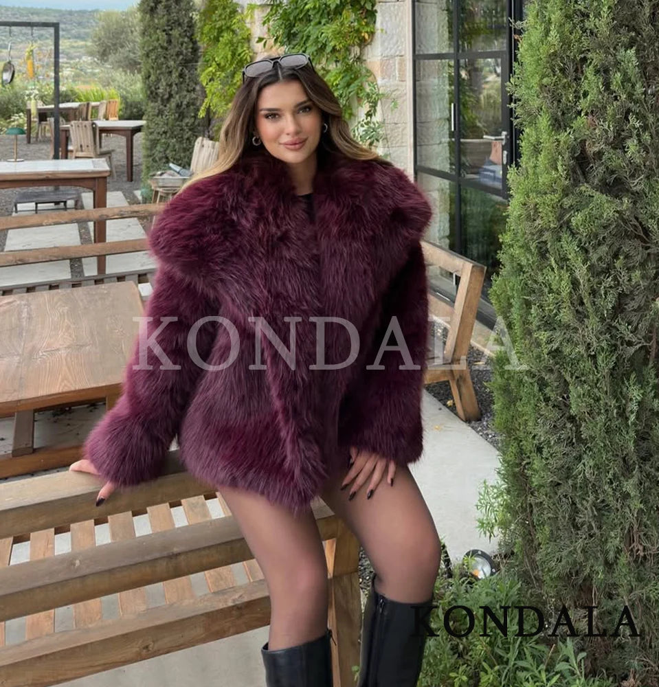 elegante abrigo de piel roja burdeos mujer